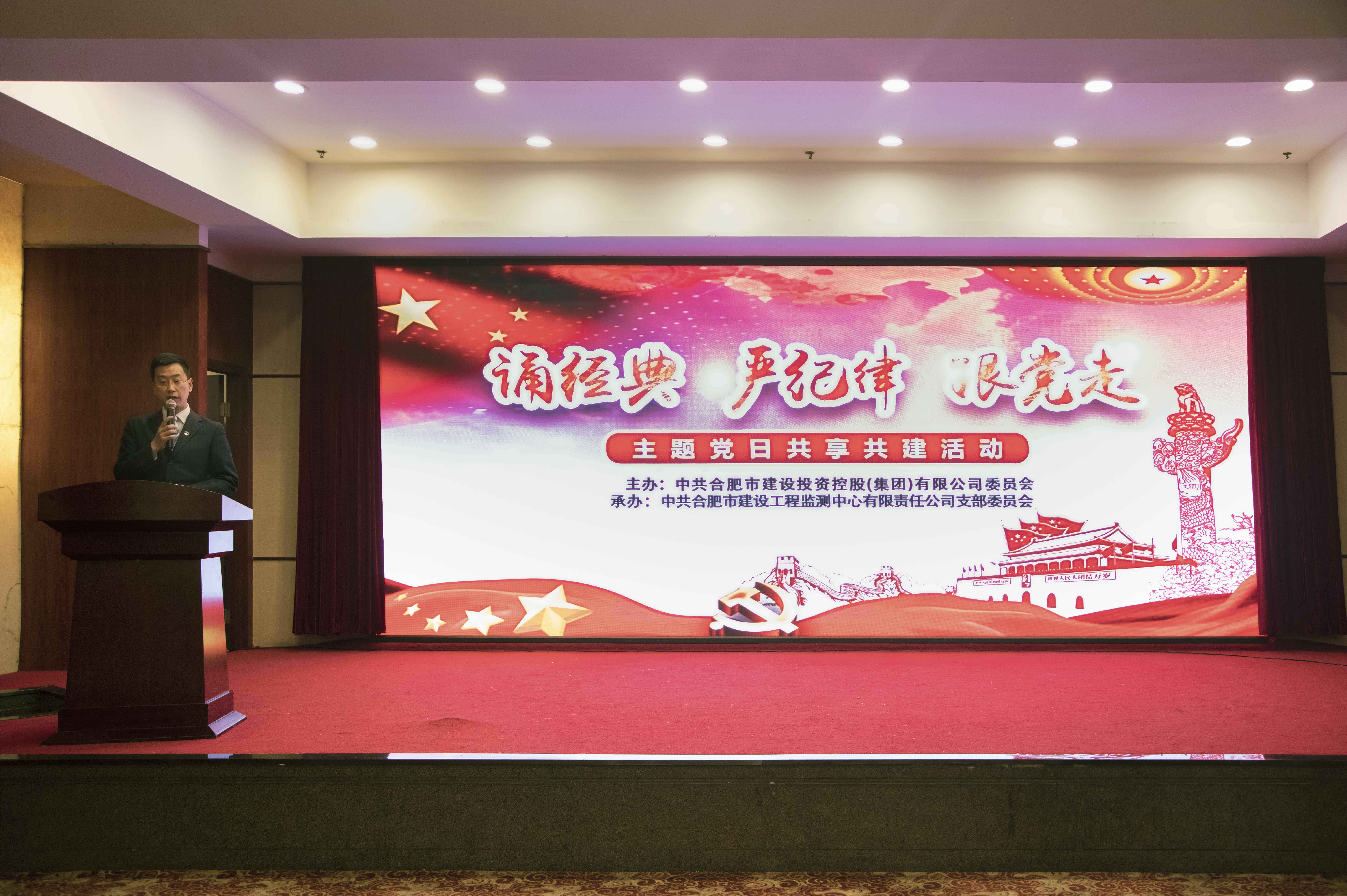 近日,由建投集团党委主办、监测中心党支部承办的“诵经典、严纪律、跟党走”11月份主题党日共建活动在合肥梅山饭店顺利举行。来自建投集团本部及所属企业一百余名党员参加活动。建投集团党委副书记倪敬东,党委委员、纪委书记、监事会主席黄跃明,党委委员、副总经理陈小蓓以普通党员身份参加此次活动。